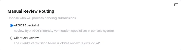 For example, if a new subscriber’s ID photo is blurry and needs to be verified again, selecting “Expert Judge” ensures that the ARGOS team handles it. On the other hand, if you require an internal review, you can select the Customer API inspection.