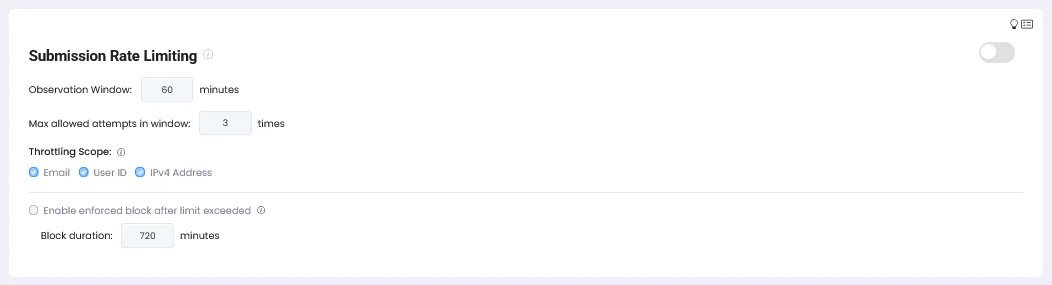 Consider an online event registration: if there’s no “once a day” limit, some people might submit hundreds of applications. In this update, KYC submissions can now have similar restrictions applied, with limits based on email address, user ID, and IP address.